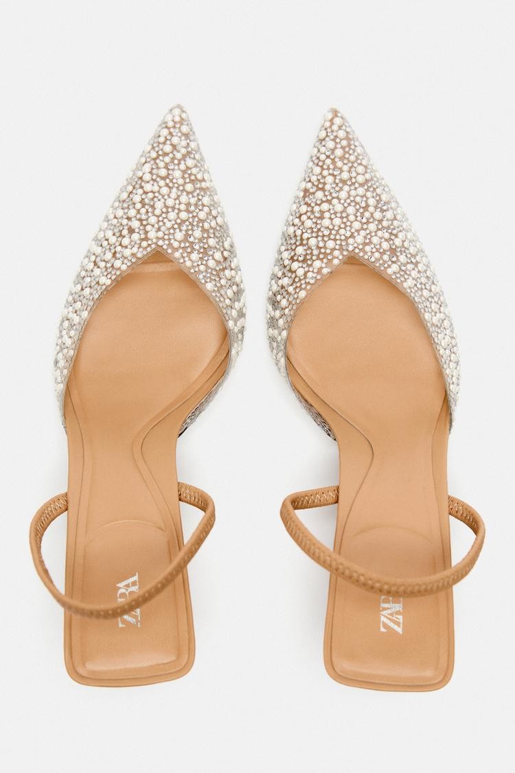 Slingback Heels With Faux Pearl Detail On The Front And A Vinyl Effect Top. Pointed Toe. Elasticated Back Strap